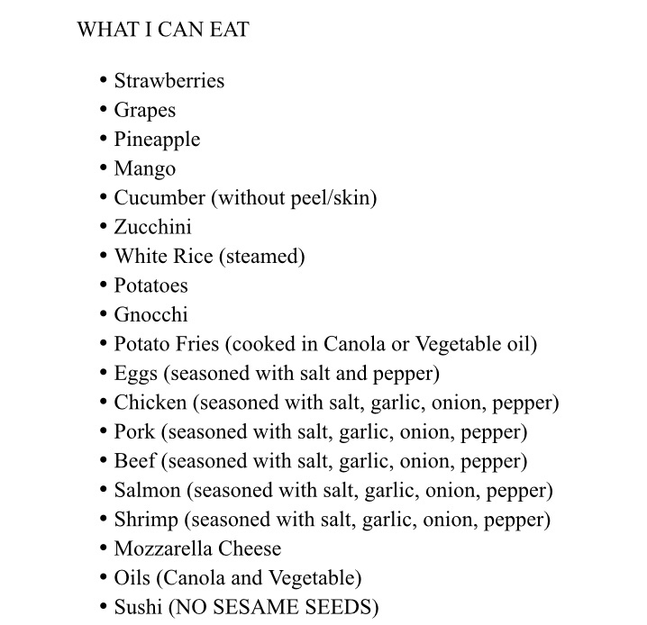 Due to my allergy, I was anxious because I was unsure of what I would be able to eat. My mom and me came up with an idea of making a list of the things I could and couldn’t eat.